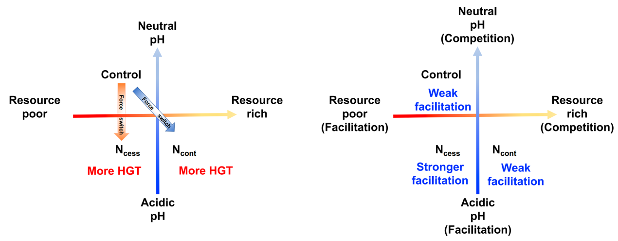 水平基因转移介导的多样化过程是群落构建中重要的进化生态学动力,然而其是否介导了微生物对人类活动干扰的响应呢?依托内蒙古锡林浩特长期施氮和停止施氮实验平台,结合土壤养分和胁迫变化,研究团队在四象限框架下提出并证实了水平基因转移和分子网络层面的假说:1)环境选择驱动力的改变使得微生物通过水平基因转移提升群落适合度;2)资源匮乏和土壤酸化胁迫提升寡营养的胁迫耐受微生物类群间的合作。此外,氮添加导致细菌水平基因事件、功能基因和病毒多样性的增加,细菌物种多样性下降,从而形成了细菌物种多样性与功能多样性之间强烈的负相关关系。