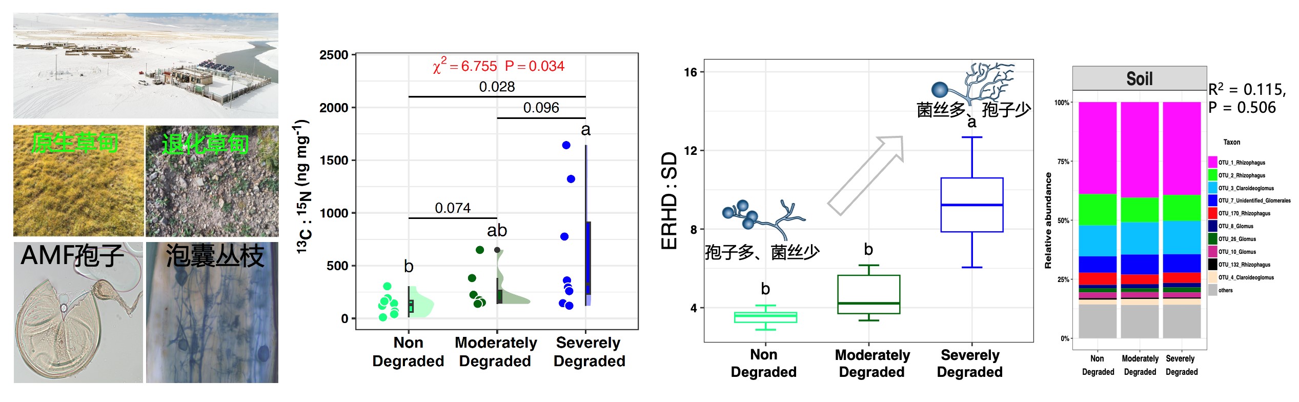 丛枝菌根共生体系具有重要生态功能,其产生、维持和发展是一个涉及环境、宿主、菌根真菌不同种类和表型结构的复杂体系。菌根共生体系如何响应青藏高原草甸退化呢?依托西藏那曲草甸退化生态监测平台,整合生物市场理论、胁迫梯度假说和生物量分配权衡策略,研究团队利用野外观测和温室同位素双标记技术,发现草甸退化增加了生物市场中植物来源碳交换菌根真菌供给氮的交易价格、增加菌根真菌网络复杂度,且菌根真菌将更多生物量投入到具有吸收功能的菌丝体、代价是减少了具有繁殖功能孢子的数量。此外,尽管根外菌丝和土壤孢子比例随草甸退化显著升高、土壤菌根真菌群落却保持稳定,暗示了丛枝菌根功能性状的可塑性。