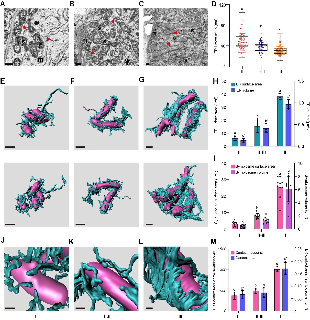 该研究运用AutoCUTS-SEM对蒺藜苜蓿(Medicago truncatula)根瘤的侵染细胞进行三维重构,观察到内质网(ER)在共生体周围富集,并且与类菌体共生界面互作。进一步对ER形态展开观察,发现随着共生体发育,ER腔体从管状转变为类片层状包裹在共生体外围,形成巢穴状结构协调共生体定殖(图1,2)。同时共生体周围的ER发生了显著扩张(图1 H、I),并且二者之间的膜接触位点也显著增多(见图1 J-M)。据此,该研究首次确认了ER动态扩张在根瘤菌共生发育过程中具有重要支持作用。