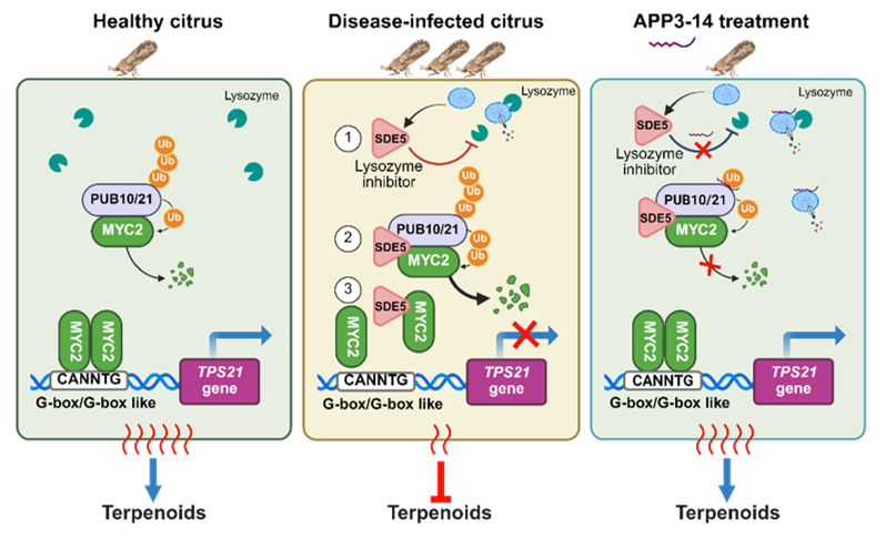 团队首先通过田间行为学观察,发现柑橘木虱偏好感染黄龙病的文旦柚。进一步开展Y型嗅觉仪行为学实验,证实感染的柑橘对木虱吸引力显著增强,气相色谱-质谱分析显示,感染植株中β-石竹烯、(E)-β-法尼烯等多种挥发性萜烯释放量显著下降,多个萜烯合成酶基因表达被显著抑制。遗传学分析结合生化实验发现,黄龙病菌效应蛋白SDE5通过干扰茉莉酸信号通路核心转录因子MYC2的稳定性和转录活性,可降低多个萜烯合酶基因表达水平,显著抑制柑橘释放β-石竹烯、(E)-β-法尼烯等挥发性萜烯类化合物,进而增强染病柑橘对木虱的吸引能力。生化酶活实验表明,SDE5蛋白具溶菌酶抑制子活性,而小肽APP3-14具有高效抗虫功能,一方面抑制SDE5的酶活性,另一方面通过稳定MYC2抗性蛋白,提高植物气味防御能力。在黄龙病感染的柑橘植株上施用APP3-14后,可显著促进萜烯释放,降低植株对木虱的吸引性,从而阻断“病原—媒介昆虫”的互惠关系,实现对柑橘黄龙病扩散传播的有效防控。