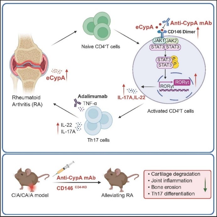 近日,中国科学院微生物研究所在Molecular Therapy上发表了题为“Extracellular cyclophilin A binding to CD146 is critical for Th17 cell differentiation in rheumatoid arthritis”的研究论文。该研究揭示了胞外亲环素A(extracellular cyclophilin A,eCypA)通过结合CD146,促进Th17细胞分化,从而调控类风湿性关节炎(Rheumatoid Arthritis, RA)的新机制,为RA治疗提供了新的靶向策略。