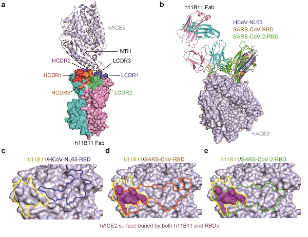 为明确h11B11抗体的作用机制和结合表位,研究人员进一步解析了h11B11与ACE2的晶体结构;该结构显示该抗体主要结合在ACE2受体N端的α螺旋结构域;抗体通过表位竞争和空间位阻效应,阻断SARS-CoV和SARS-CoV-2 RBD区域与ACE2受体的结合来抑制病毒入侵宿主细胞(图4)。