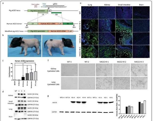 图2.hACE2人源化猪模型的构建及其细胞对SARS-CoV-2的敏感性研究结果