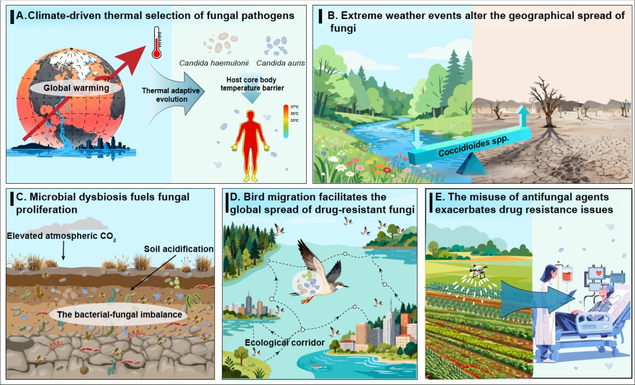 真菌病原体涌现的环境与人为驱动因素示意图