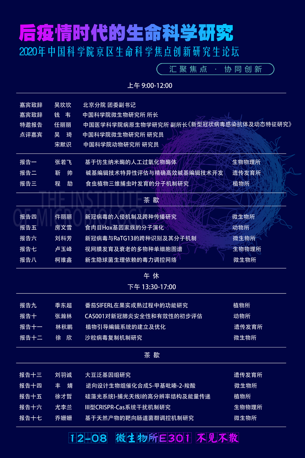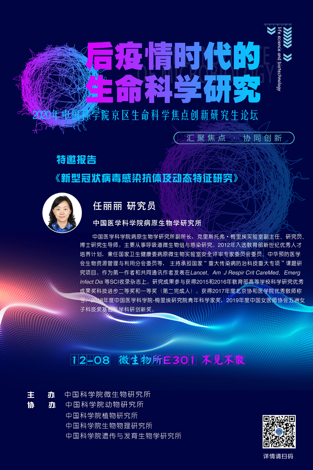 2020年初暴发的新冠疫情在给人类社会发展带来重大威胁的同时,也为科技创新带来了前所未有的机遇和挑战。近日,习近平总书记在科学家座谈会上发表的重要讲话中强调,希望广大科学家和科技工作者肩负起历史责任,坚持面向世界科技前沿、面向经济主战场、面向国家重大需求、面向人民生命健康,不断向科学技术广度和深度进军。为推动生命科学研究进一步走向深入,中国科学院京区生命科学焦点创新研究生论坛拟定于2020年12月8日在中国科学院微生物研究所举行。