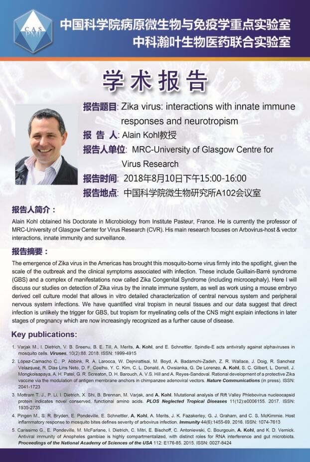 病原室学术报告:Zika virus: interactions with innate immune responses and neurotropism