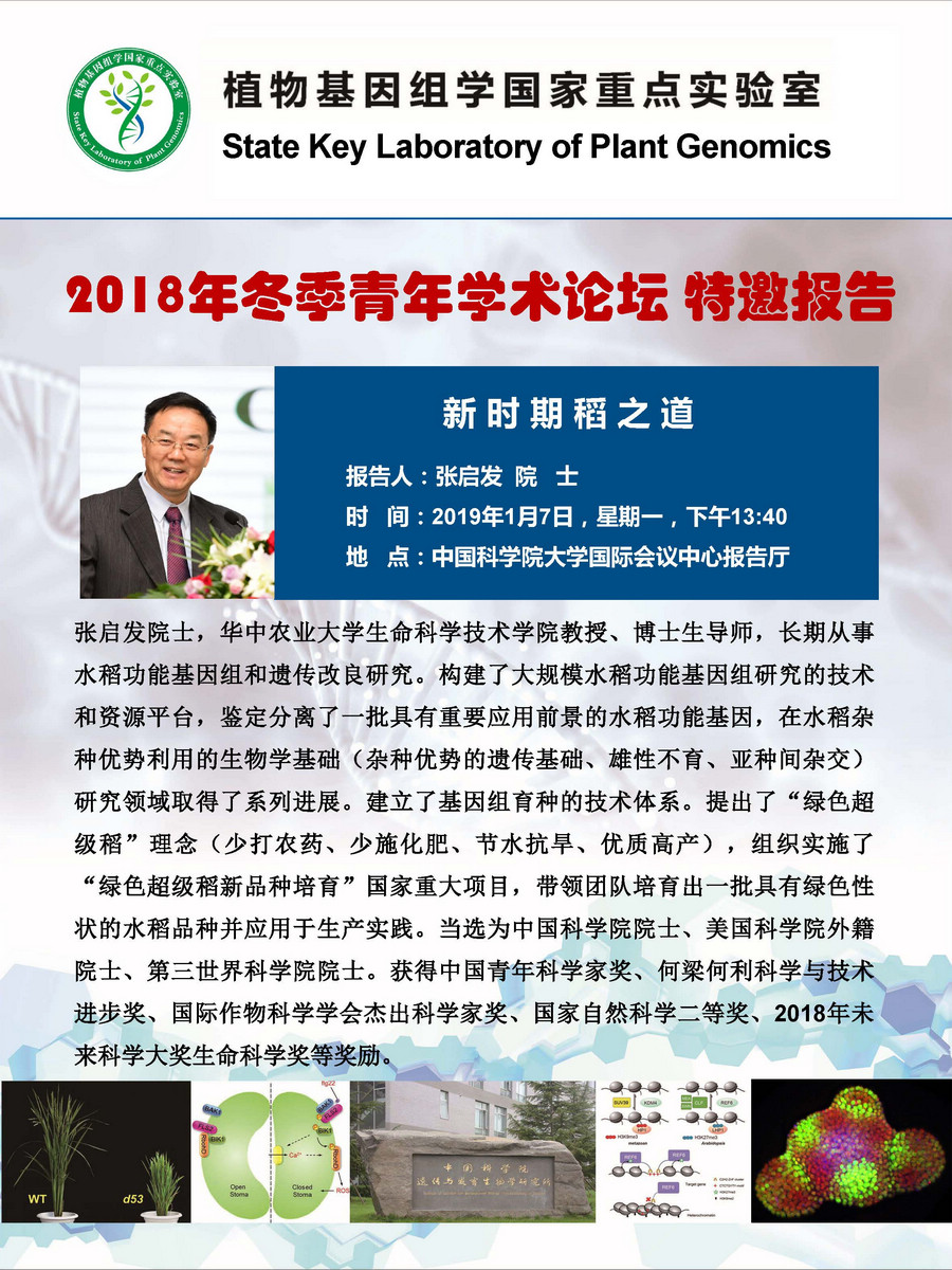 植物基因组学国家重点实验室2018年度冬季青年学术坛特邀报告——新时期稻之道(2019年1月7日13:40)