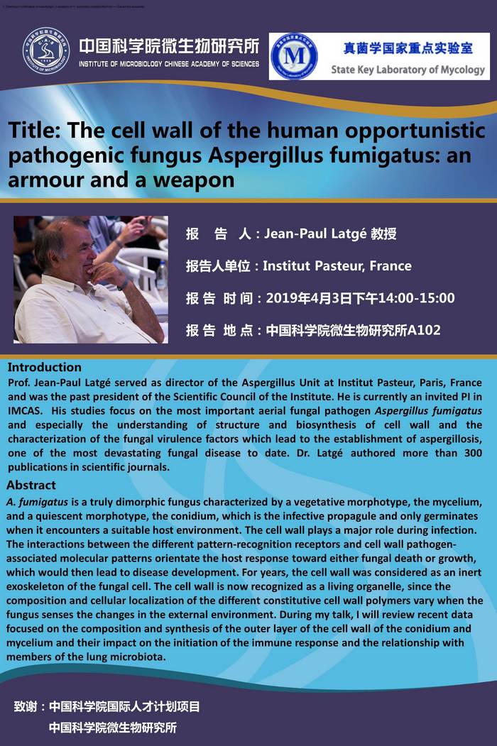 真菌室学术报告:The cell wall of the human opportunistic pathogenic fungus Aspergillus fumigatus: an armour and a weapon