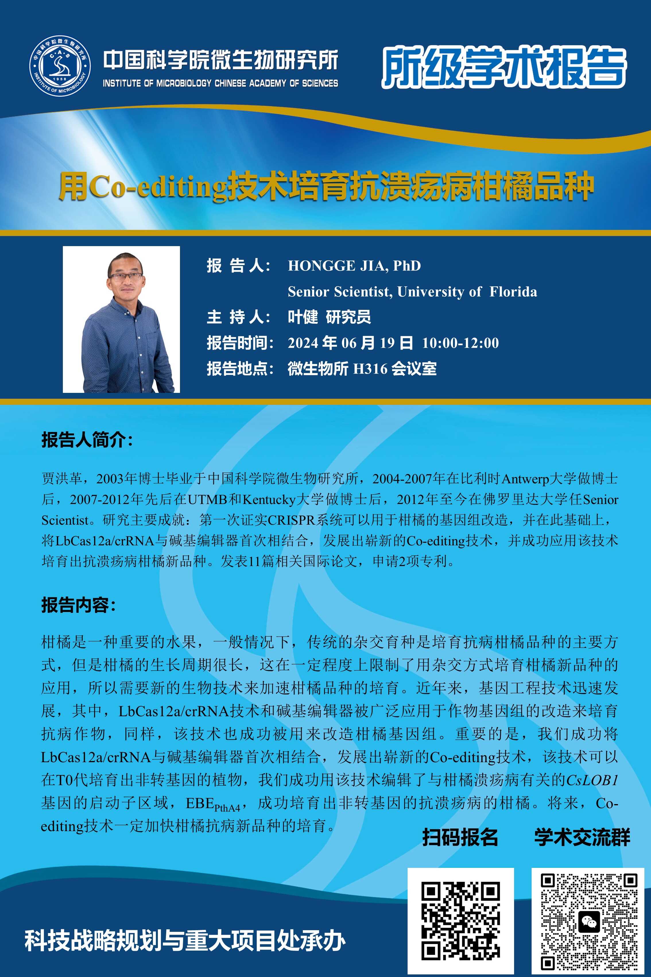 所级学术报告:用Co-editing技术培育抗溃疡病柑橘品种