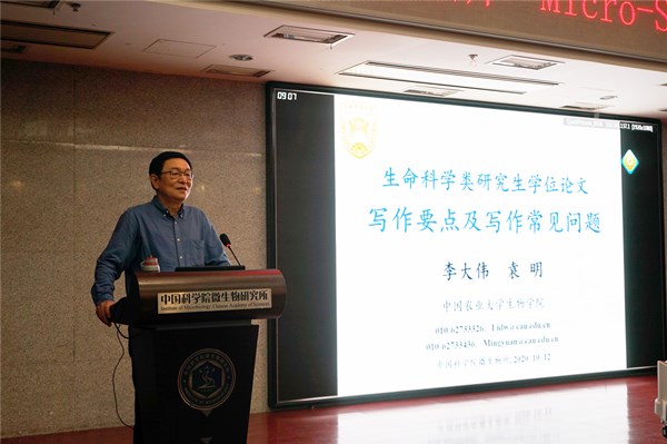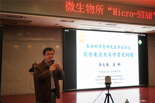 为全面贯彻党的教育方针,落实立德树人、全面育人的根本任务,在研究生部的指导下,研究生会自2020年4月起创办了“Micro-STAR科研技能学术沙龙”,坚持需求导向和问题导向,旨在通过举办科研素养和创新能力系列讲座,全面提升研究生的综合素质。近些年,为加强学术道德和学风建设,教育部和有关部门相继出台系列规定,加大对研究生学位论文的抽查和审核的力度。为进一步强调学位论文撰写规范的重要性,同时加深研究生对学位论文撰写规定理解,研究生部特别邀请了中国农业大学生物学院李大伟教授做客“Micro-STAR特约讲座”,在E301会议室为研究生带来《生命科学类研究生学位论文写作要点及写作常见问题》的专题讲座。会议由研究生部副主任程浩主持。