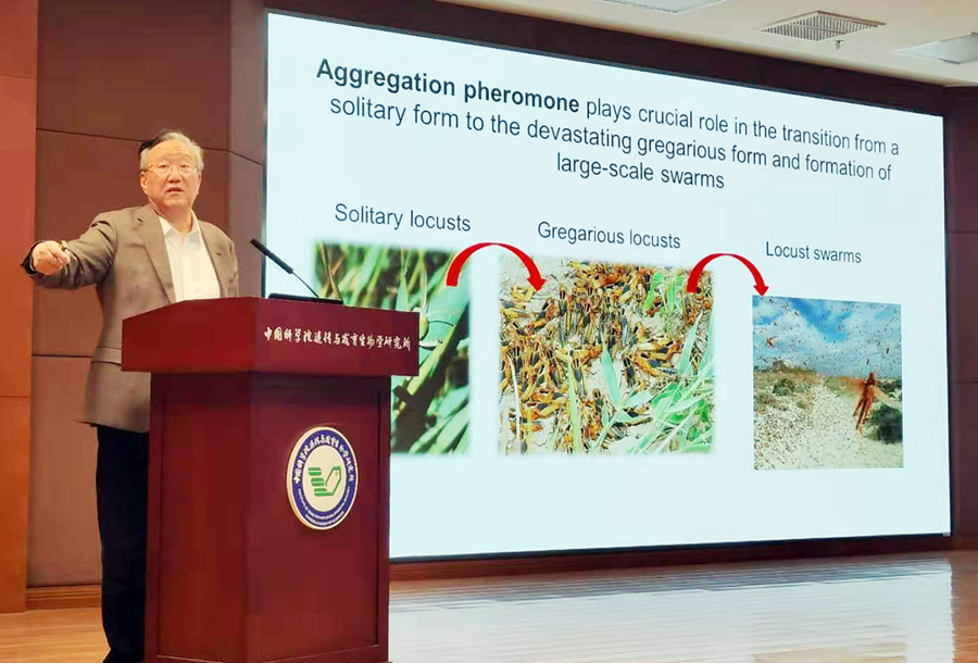 论坛邀请中国科学院动物研究所康乐院士进行题为“Secret of locust swarming and plagues: balance of two pheromones PAN and 4VA resulting in locust aggregation”的特邀报告,周俭民研究员主持报告。康乐院士介绍了其团队长期从事的生态基因组学研究,系统地揭示了PAN和4VA两种信息素的平衡导致蝗虫群聚的奥秘,为在场师生带来了一场精彩绝伦的学术盛宴。报告现场座无虚席,气氛热烈,现场听众无不为康院士团队在飞蝗群聚机制研究中取得的里程碑式突破感到由衷的敬佩,不断响起雷鸣般的掌声。