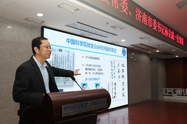 孙立成对微生物所在抗疫科研攻关中取得的成绩表示钦佩,代表济南市委市政府对微生物所给予的支持表示感谢。他指出,山东省与中科院一直保持着密切合作关系,双方的合作与国家“第五大战略”和“十四五”规划中对济南市的定位高度契合,符合国家战略布局与区域经济发展的要义。在山东省深入实施创新驱动发展战略、加快产业转型升级的关键时期,打造“科创济南”“康养济南”,离不开科技创新这一核心要素。济南市愿意与微生物所开展更加深入的合作,推动更多科技成果的转移转化。孙立成书记对微生物所提出的问题和建议也一一进行了答复和安排。