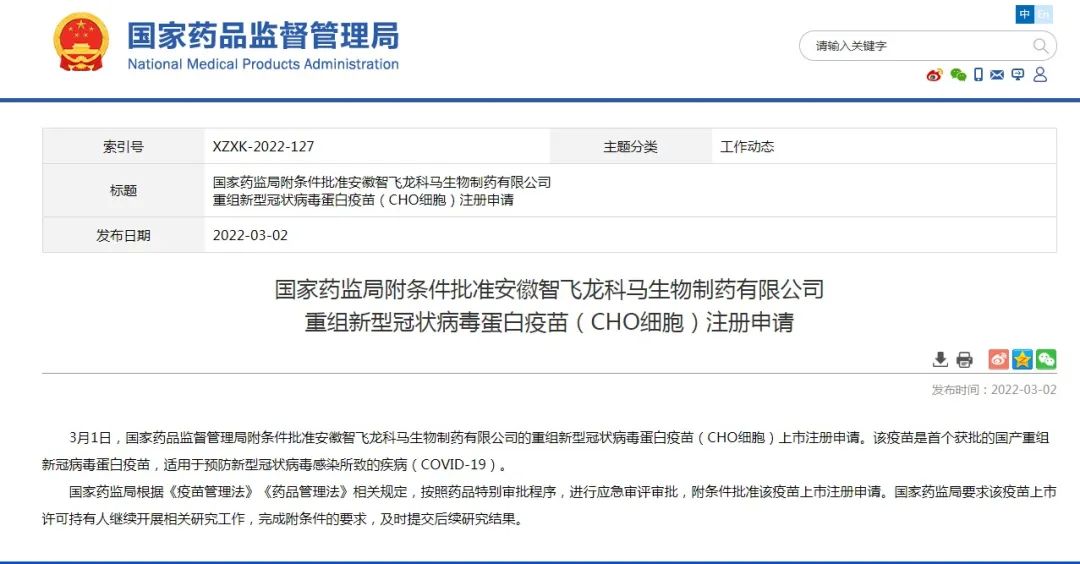 3月1日,国家药品监督管理局附条件批准安徽智飞龙科马生物制药有限公司的重组新型冠状病毒蛋白疫苗(CHO细胞)上市注册申请。该疫苗是首个获批的国产重组新冠病毒蛋白疫苗,适用于预防新型冠状病毒感染所致的疾病(COVID-19)。
