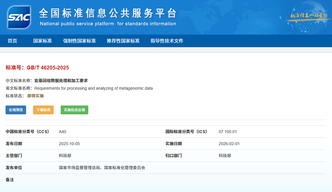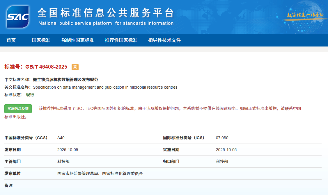 2025年10月5日,由全国科技平台标准化技术委员会(SAC/TC486)归口,中国科学院微生物研究所国家微生物科学数据中心牵头制定的两项微生物领域国家标准——《微生物资源机构数据管理及发布规范》(GB/T 46408-2025)、《宏基因组数据处理和加工要求》(GB/T 46205-2025)正式发布。