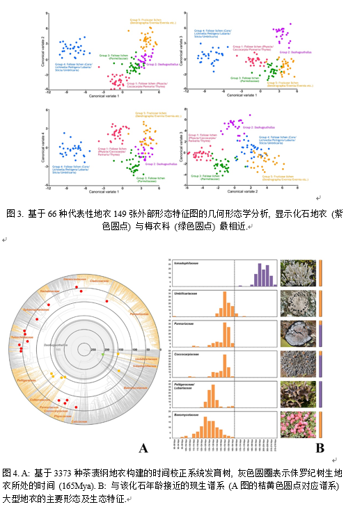 研究团队利用几何形态学分析(geometric morphometric analysis,GMA)定量评估了该化石地衣与现生地衣谱系的亲缘关系,并基于分子钟分析得到的各相关地衣谱系的分歧时间,共同支持该化石地衣归于一个独立新科Daohugouthallaceae。侏罗纪大型树生地衣的出现为地衣早期演化提供了直接的关键证据,更新了当前对大型地衣演化的认识。