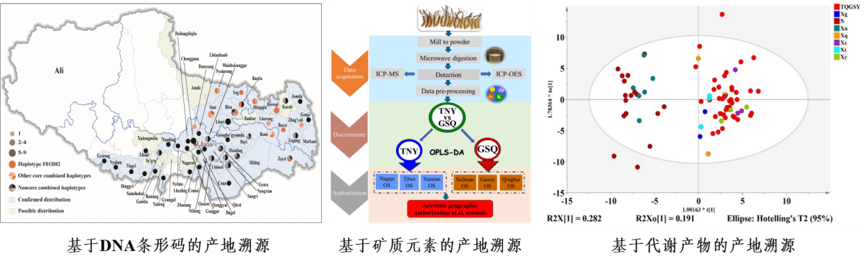 中国科学院微生物研究所董彩虹团队联合扬州大学李熠团队、那曲市检验检测中心,协同开展冬虫夏草鉴别与产地溯源技术研究。团队采用非靶代谢组学(UHPLC-QTOF-MS)结合建模分析,实现了对样品产地的精准识别(Food Chemistry ,2024);通过对数十种矿质元素含量的建模分析,产地判别准确率达90.48%(Microchemical Journal,2024);基于ITS与COI序列识别出99个单倍型,实现了产地精准划分(IMA Fungus ,2025)。这些溯源技术为打击产地造假违法行为提供科学依据,获得地方政府的认可。