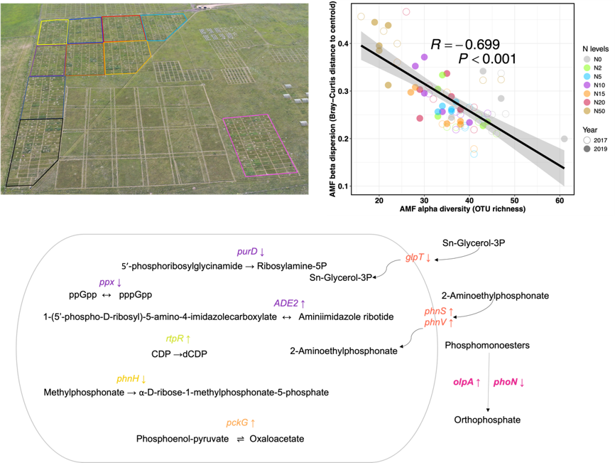 丛枝菌根真菌是陆地生态系统中一类关键的微生物群落,在介导跨物种共生与养分循环、调控土壤微生物组互作及维持生态稳定性方面具有重要作用。当前,由人类活动导致的氮沉降日益加剧,丛枝菌根真菌对氮沉降的响应,可为理解全球变化对生态系统的影响提供关键证据。该研究依托内蒙古草地长期氮添加(模拟氮沉降)试验平台开展研究,结果表明随着氮添加量的增加,丛枝菌根真菌群落的beta多样性上升,而alpha多样性下降。通过多元协同惯量分析(MCoA)进一步发现,丛枝菌根真菌群落、细菌群落及其功能对外源氮输入存在协同响应的现象,且该响应模式与土壤磷有效性显著相关(R² > 0.9)。此外,网络分析结果显示,外源氮添加可选择性地富集放线菌门等与丛枝菌根真菌协同作用的微生物类群,并增强了与资源获取和初级代谢相关功能的表达,但未发现磷矿化功能富集的相关证据。