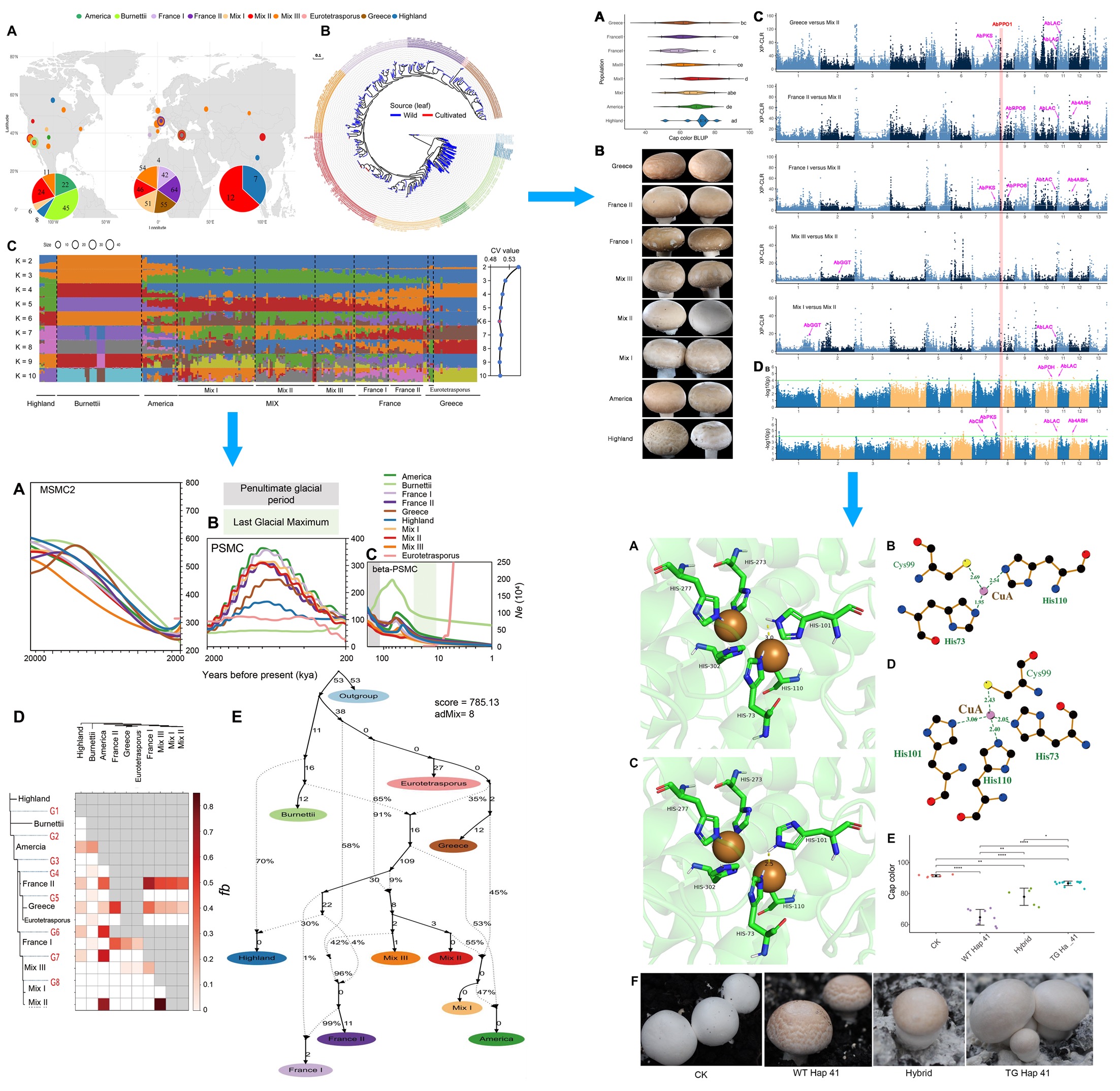 该研究将进化基因组学与驯化遗传学方法相结合,阐明了历史气候动态演变在塑造大型真菌遗传多样性中的作用,揭示了双孢蘑菇的驯化历史及其重要商业性状——菌盖颜色的遗传机制,为双孢蘑菇种质资源的高效利用与分子育种提供了基因组学框架。