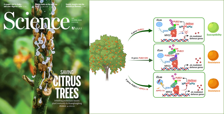 柑橘黄龙病被称为“柑橘界的癌症”,这种由‌亚洲韧皮杆菌‌引发的毁灭性病害,已肆虐全球近50个国家,导致柑橘产业年均损失超百亿美元‌。中国科学院微生物研究所叶健团队成功解析柑橘抗黄龙病核心分子机制,并利用人工智能(AI)技术筛选出可有效防控该病害的小肽。这项研究不仅破解了困扰国际农业界缺乏柑橘黄龙病抗性基因的科学难题,也为全球柑橘产业可持续发展提供了新的解决方案。该项成果于2025年4月11日作为封面文章发表在《科学》(Science)上。