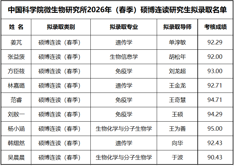 中国科学院微生物研究所2026年(春季)硕博连读研究生拟录取名单