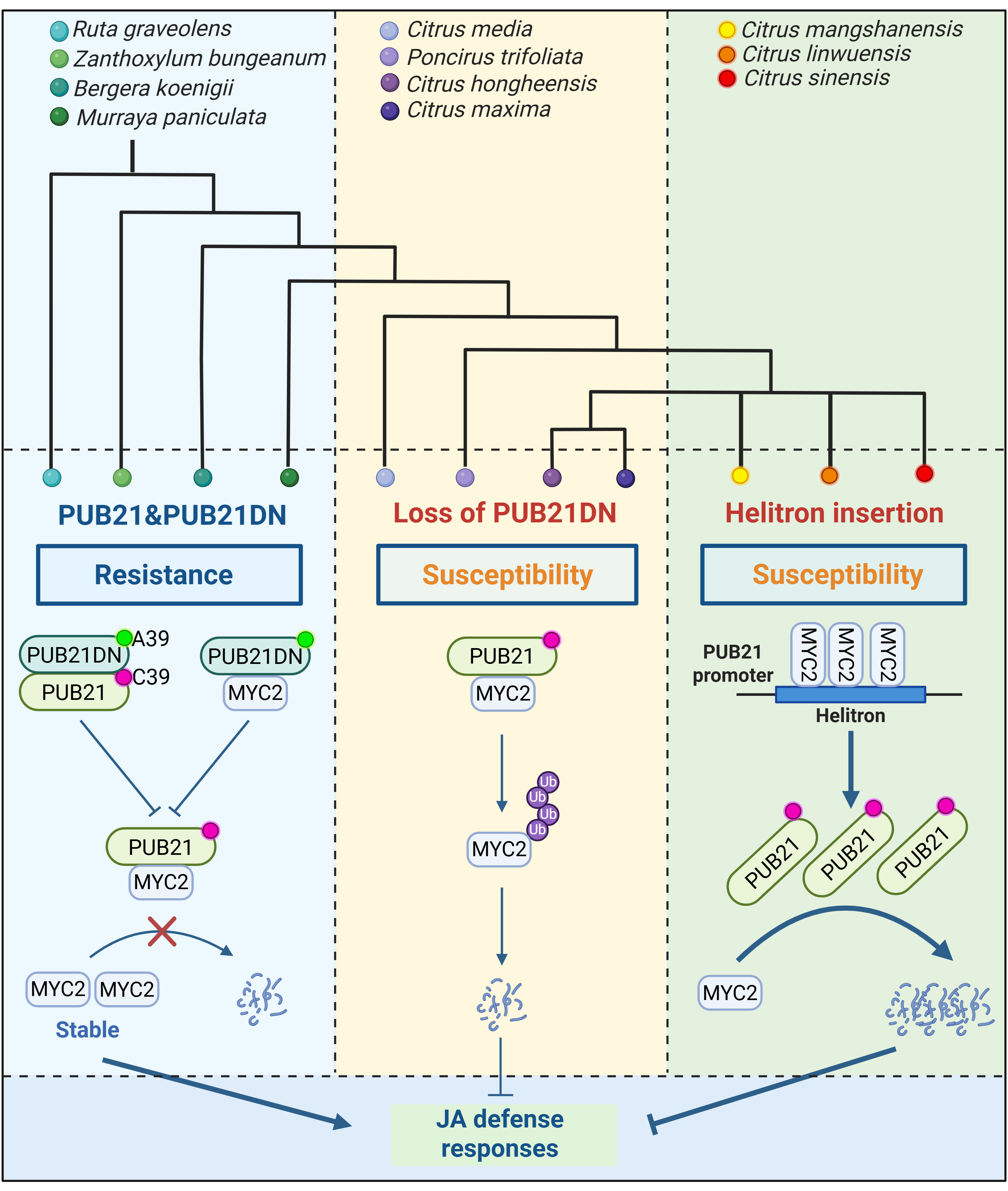 图 1. 柑橘及其芸香科近缘种中与黄龙病(HLB)抗性相关的两大PUB21基因进化事件