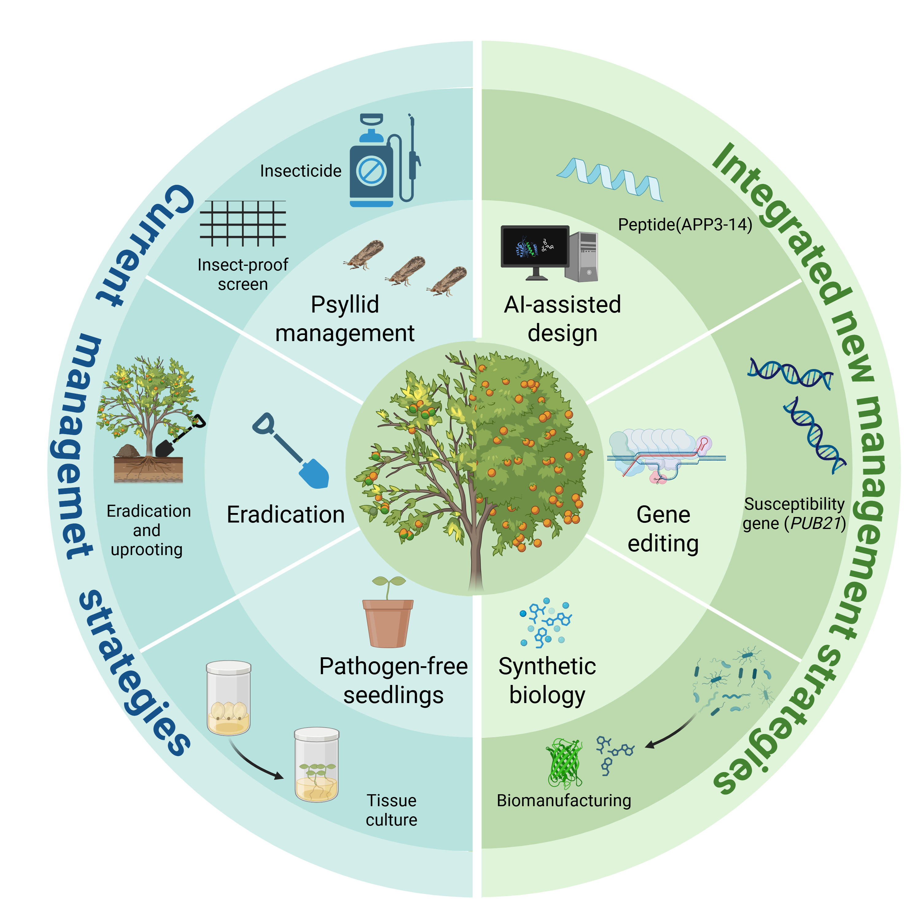 近日,中国科学院微生物研究所叶健研究团队在Trends in Plant Science 在线发表题为“Fighting citrus Huanglongbing with evolutionary principles”的观点文章。文章系统阐明了进化信息指导的病虫害管理(EIPM)的核心逻辑 —— 以进化原理为底层框架(图1),结合人工智能(AI)、基因编辑、合成生物学等前沿技术(图2),为 HLB 防控提供长效、精准的创新解决方案。未来,随着EIPM理念与AI、合成生物学等技术的进一步深度融合,有望为全球柑橘产业可持续发展注入新动能,也为其他作物毁灭性病害的防控提供“进化+技术”的跨学科解决方案。