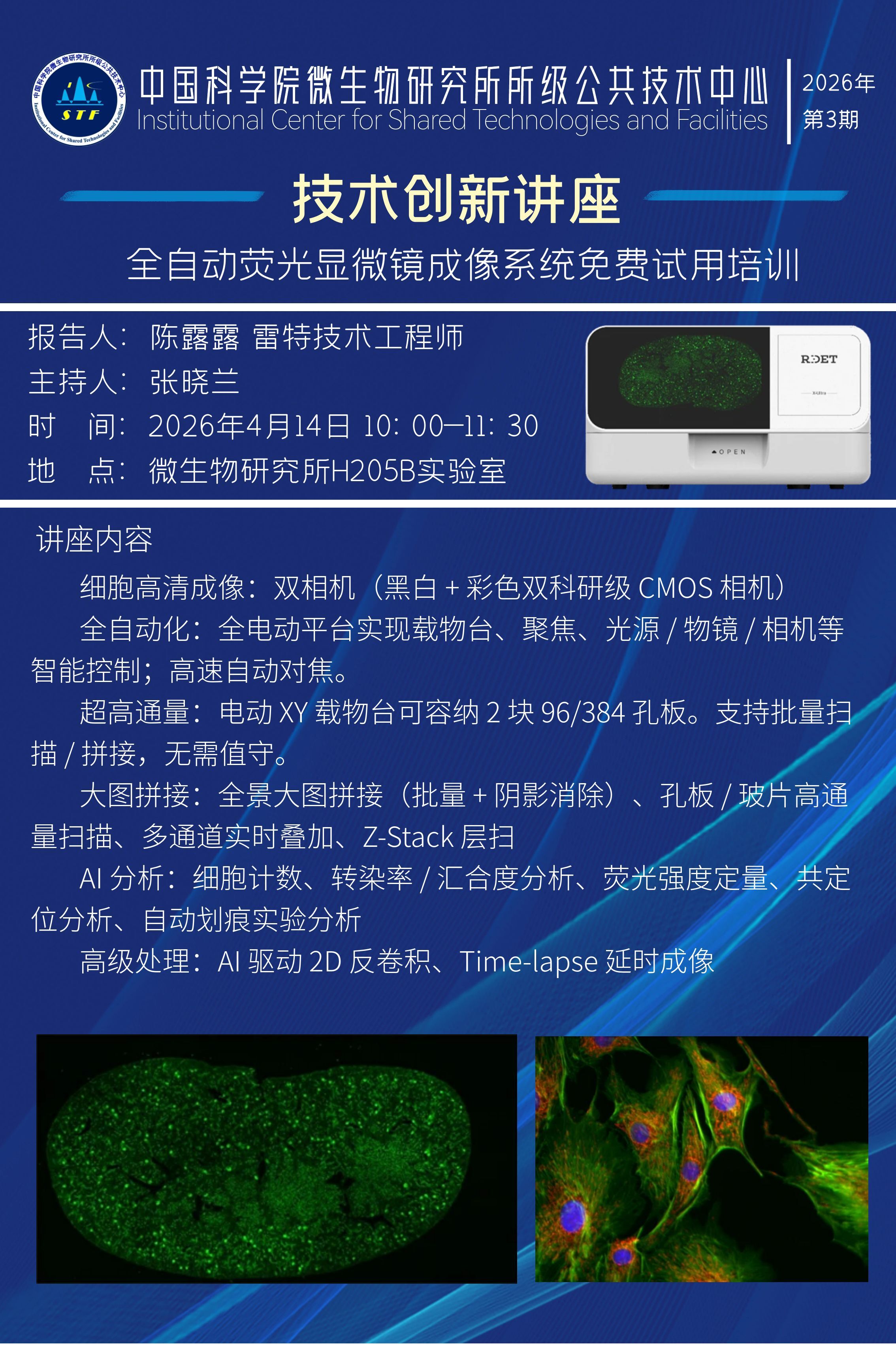 关于举办【2026-04-14】技术创新讲座:全自动荧光显微镜成像系统免费试用培训的通知