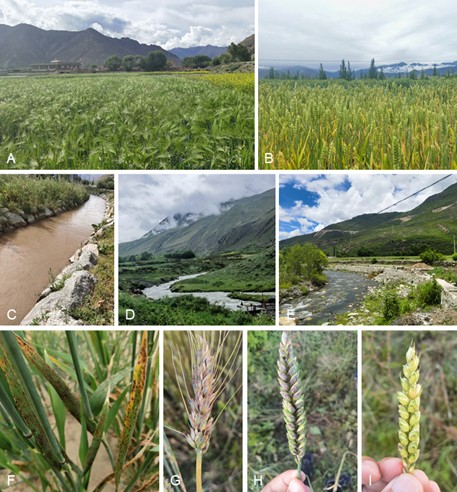 图2. 西藏的农田景观。a: 西藏青稞田地(日喀则南木林县);b: 小麦田地(山南贡嘎县);c-e: 农田旁的河流(山南琼结县);f-I: 镰孢菌及其相关属引起的植物病害