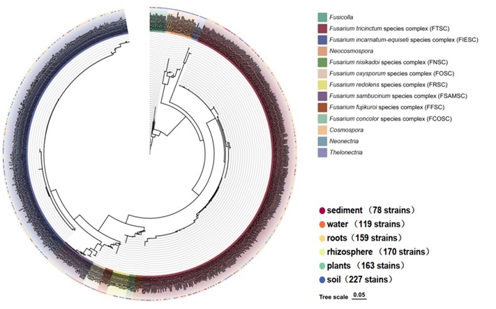 图4. 本研究获得的镰孢菌及近缘类群的系统发育多样性与基质分布